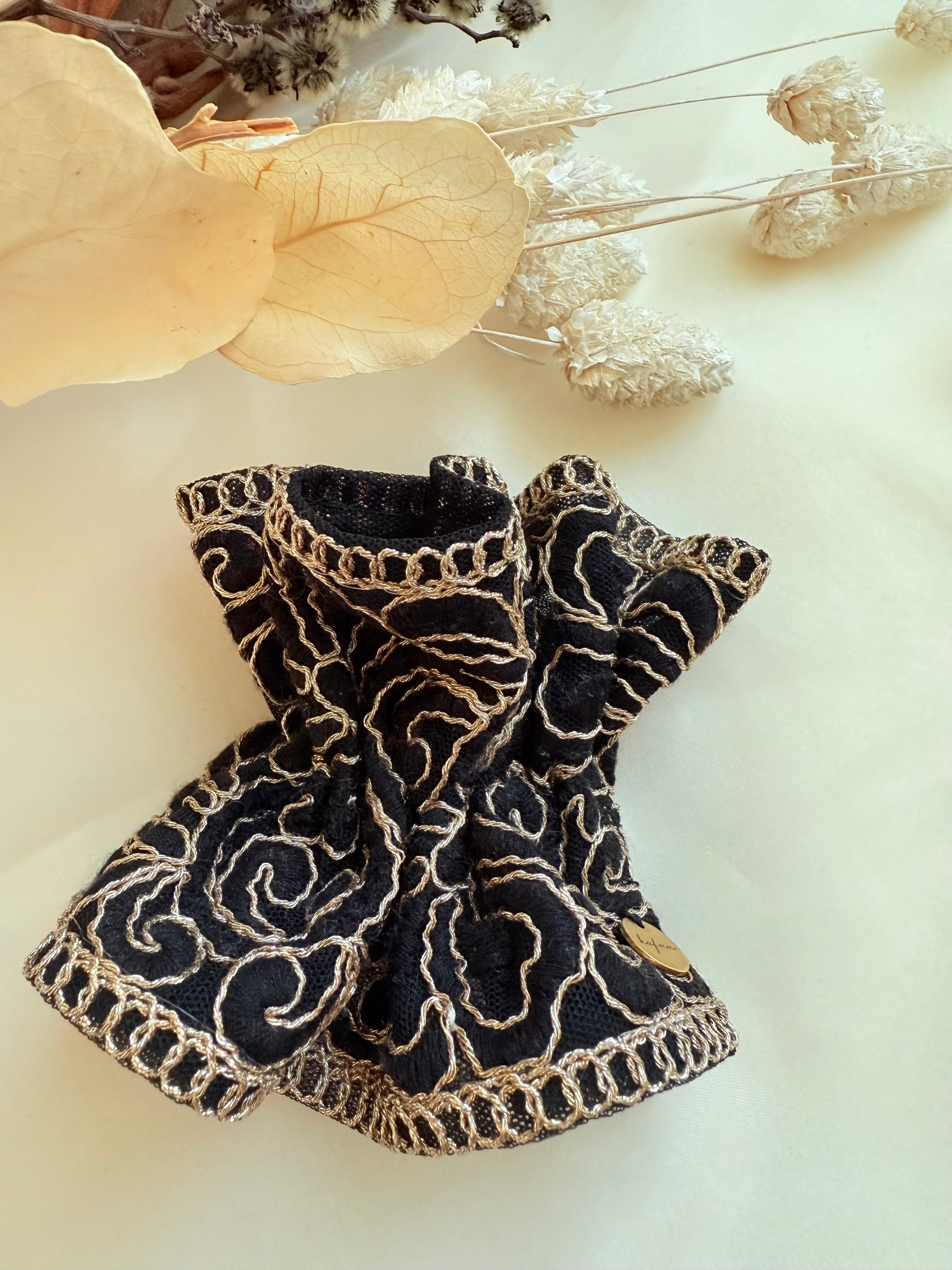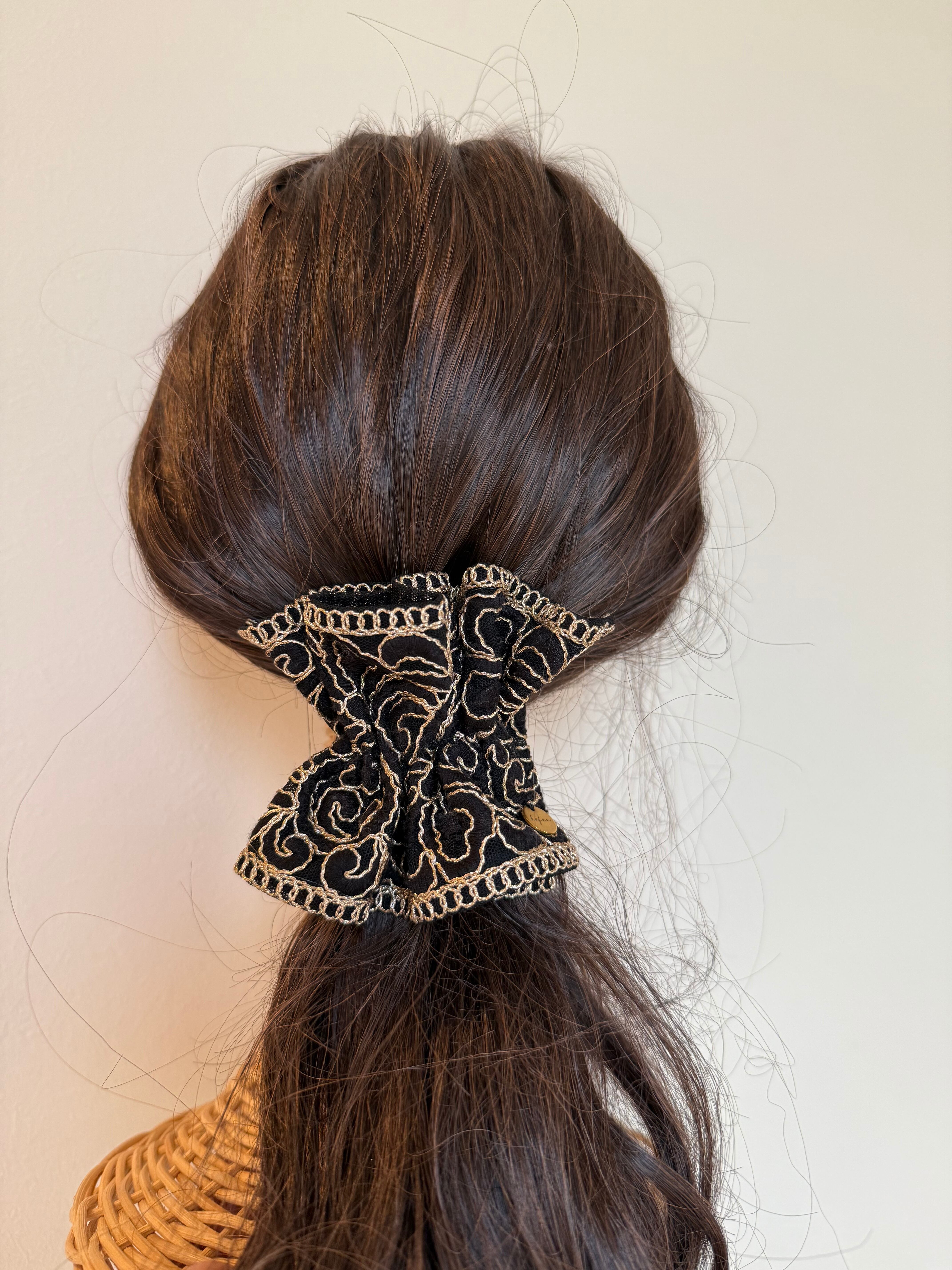 華やかなインド刺繍リボンを贅沢に使い、ギャザーを寄せてふんわりと仕上げたポニーフックです。