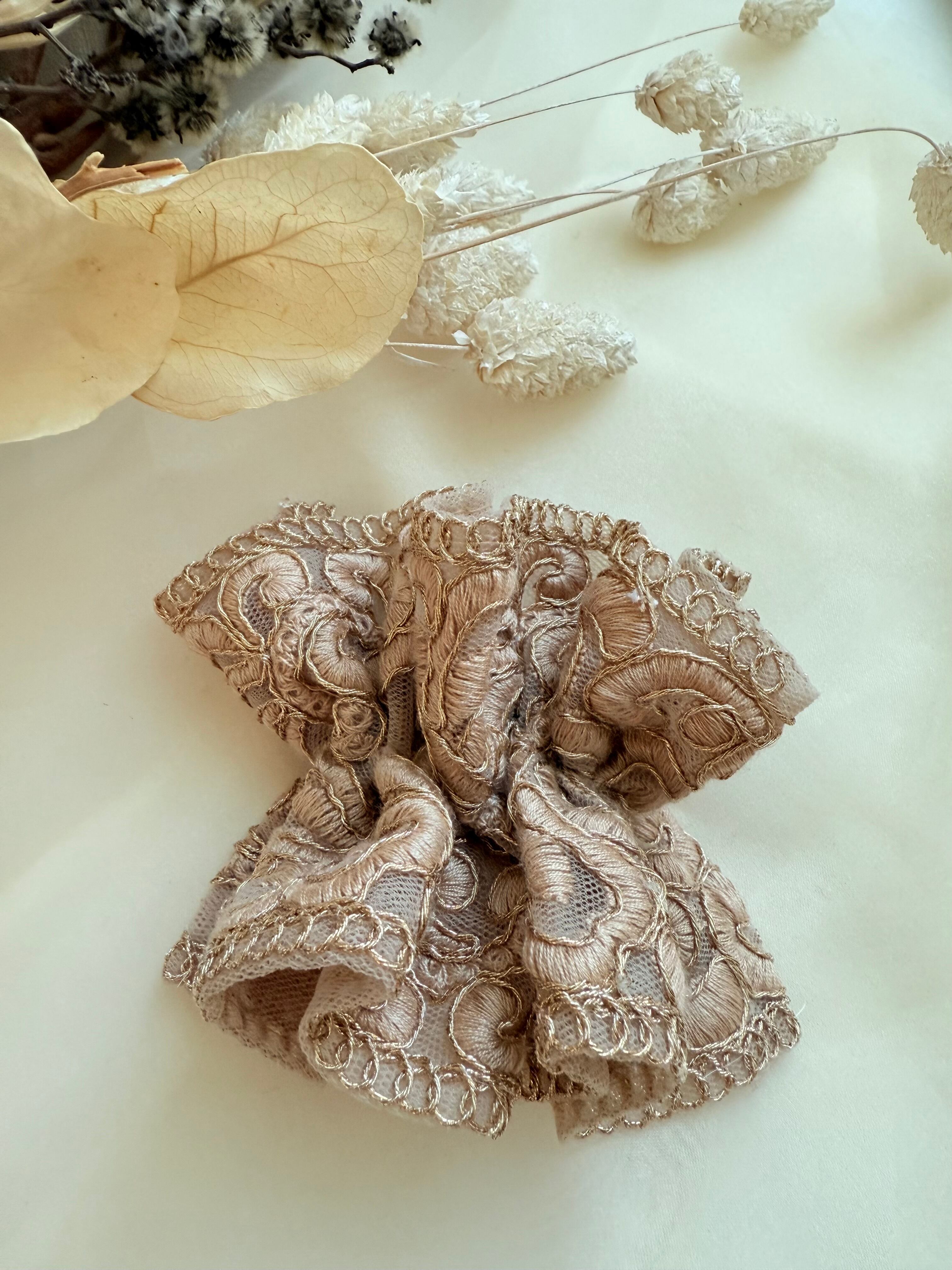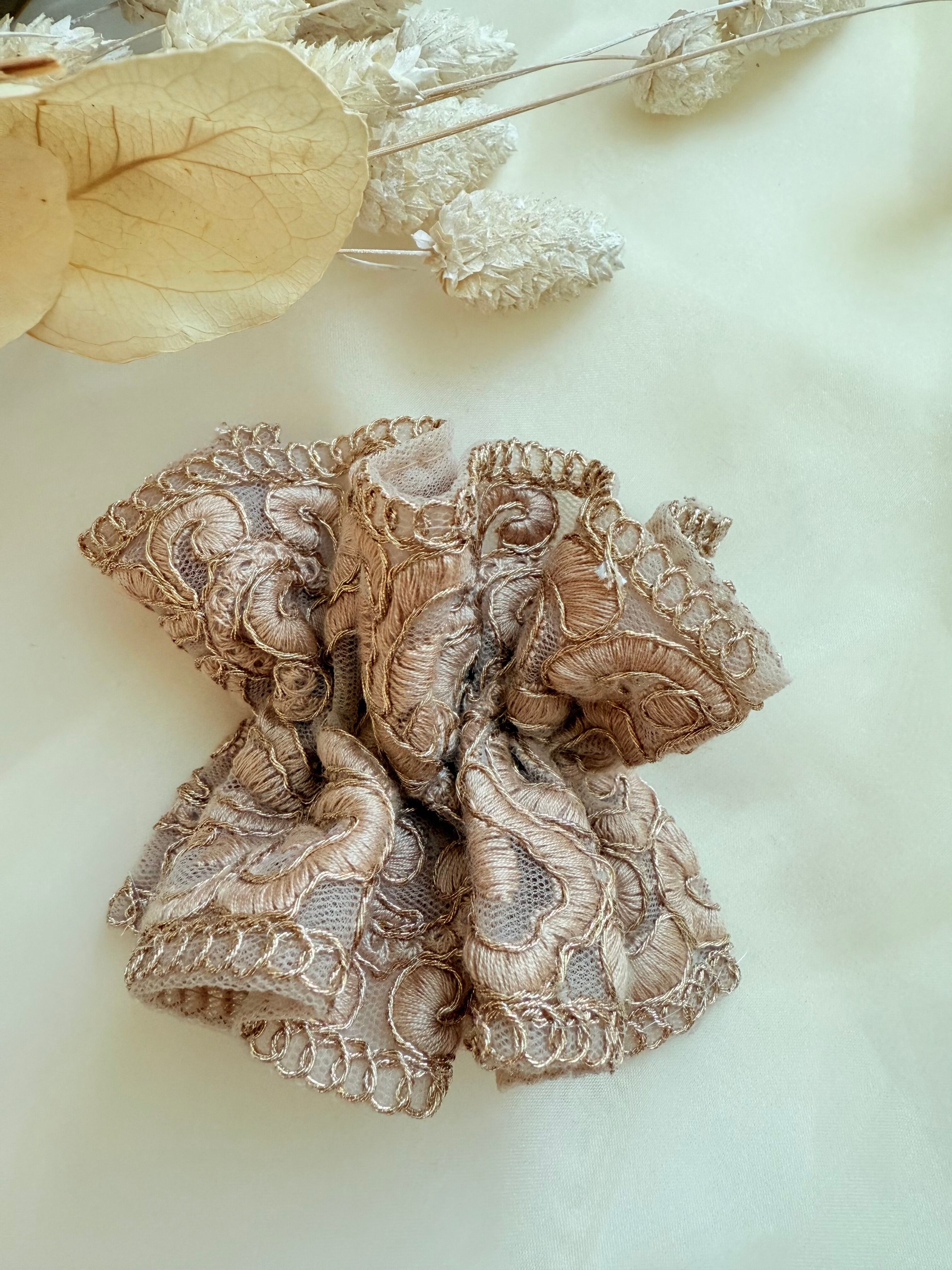華やかなインド刺繍リボンを贅沢に使い、ギャザーを寄せてふんわりと仕上げたポニーフックです。