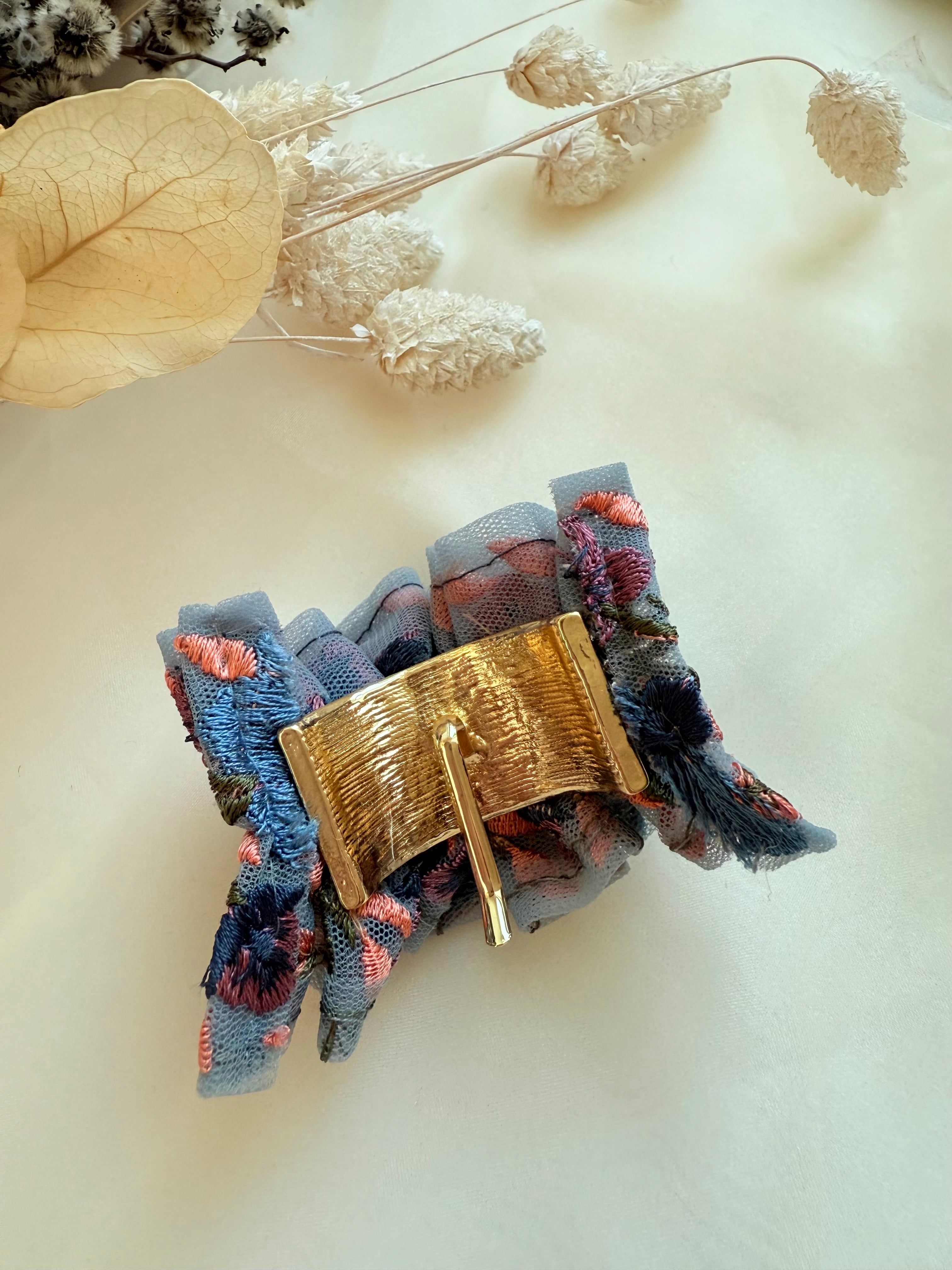 華やかなインド刺繍リボンを贅沢に使い、ギャザーを寄せてふんわりと仕上げたポニーフックです。