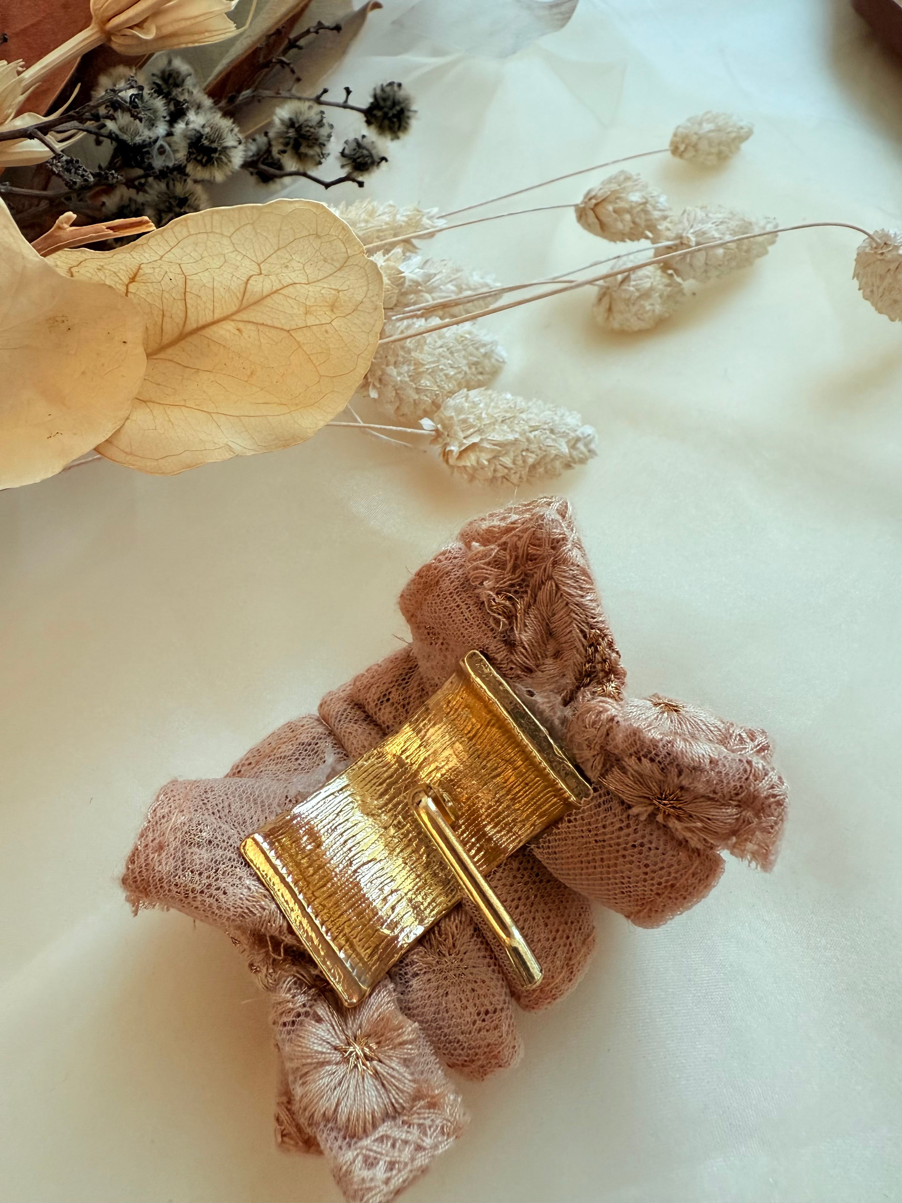 華やかなインド刺繍リボンを贅沢に使い、ギャザーを寄せてふんわりと仕上げたポニーフックです。